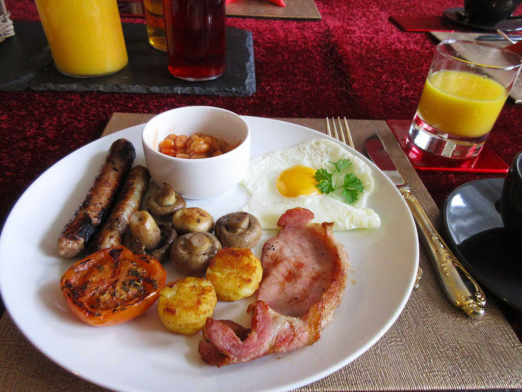 The dining room is something to behold with elaborately carved antique chairs, tapestry, rugs and walls covered in curiosities of all kinds. The breakfast served there is equally impressive. Full English breakfast is the default, but vegetarian and gluten-free alternatives are available too. There’s a terrace to sit out when the sun is shining, and a lounge for when it’s not, filled of course with exotic bibelots.