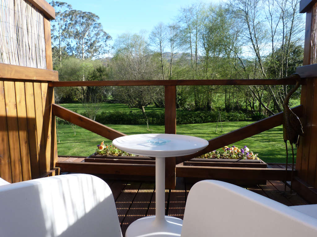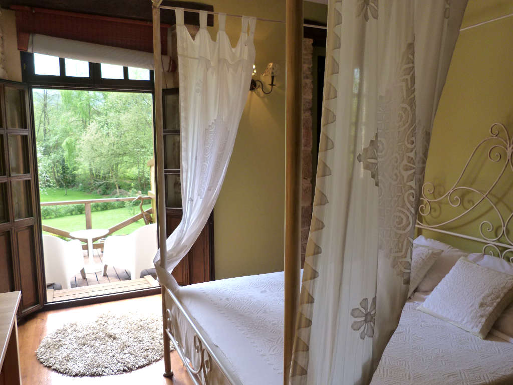 La Huerta. The most romantic room, with a four-poster double bed, a nice wooden terrace with views of the garden and river and a special bath open to the bedroom with hydromassage bathtube.